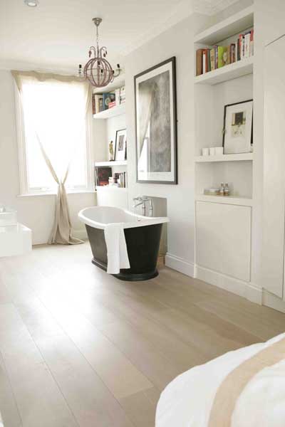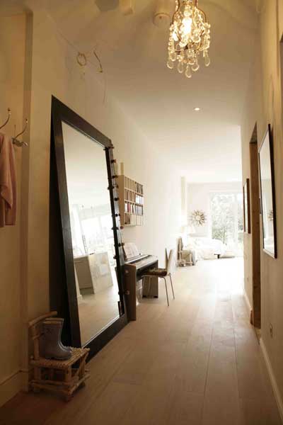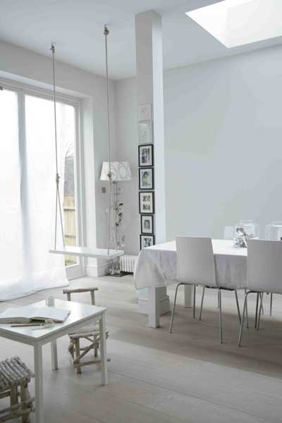 Me confieso fan de los espacios blancos puros, aunque aquí no se hace frío con el aspecto vivido de las imágenes. Me chiflan los suelos de madera clara, con aspecto de madera sin tratar, de listones anchos y largos. Creo que aportan una calidez maravillosa. (Yo soy de las que se gastaría un verdadero pastón en poner un suelo así aunque después tuviera que poner muebles de ikea. «La caja» es taaaan importante…)