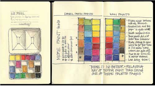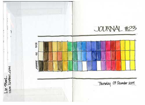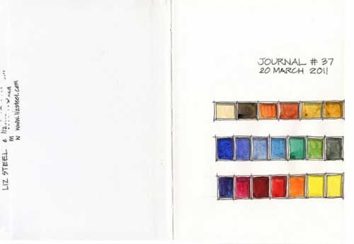 Siempre que comienza un nuevo cuaderno lo inicia así: pintando los colores que utilizará en las páginas siguientes. Me chiflan todos sus dibujos,  pero estas primeras paginas me parecen preciosas.