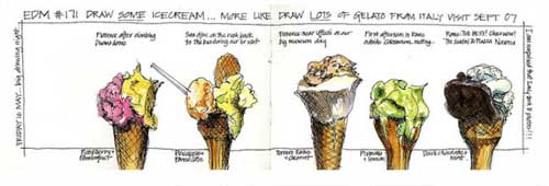 Al lado de sus dibujos escribe pequeñas notas describiendo el lugar, la acción, lo que ocurre, o los tipos de helado como en esta lamina.