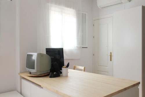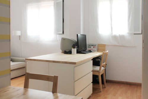 La zona del ordenador era un espacio obligado. Me inventé una superficie grande de trabajo que a la vez tuviera mucho espacio para guardar. Dos cajoneras contrapuestas de 3 cajones y un modulo de cocina debajo de la tele, con un precioso tablero de pino hacen de mesa para trabajar. Esta superficie nos da la vida, porque la utilizamos para todo!. Ademas sirve de separación con la zona del sofá sin agobiar el espacio.