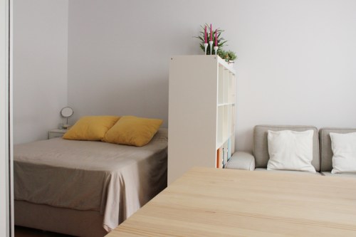 Es un pequeño estudio de 25 metros cuadrados, un bajo interior, pero con muchísima luz. Tenemos la suerte de tener un patio muy amplio y entra el sol por las ventanas casi todo el día. Y claro, además es super silencioso.