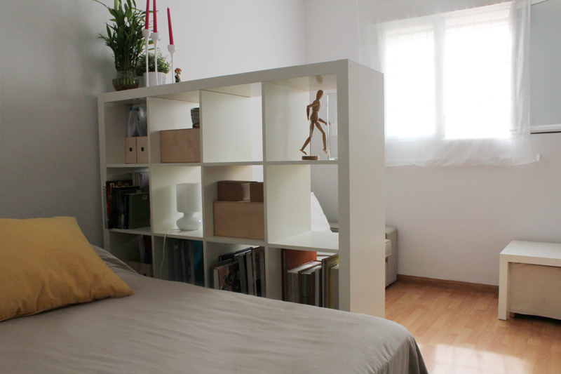 Desde la mesa del ordenador podemos ver la cama y el sofá. La zona del dormitorio está enmarcada por el armario (que queda a la izquierda del todo en la foto superior) y la Expedit, que sirve por un lado de mesilla y por otro de estantería general. No resta demasiada luz porque la Expedit no tiene fondo. La cama, con canapé para guardar ropa de cama, ropa de verano, trastos varios en general…….