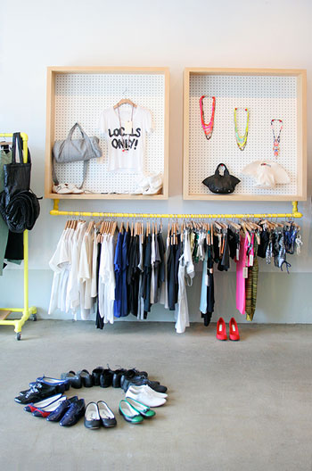Estos marcos de madera aparentemente pino, en contraste con esas tuberías pintadas en amarillo potente, a modo de perchero junto con la manera de exponer los complementos en esa trasera perforada me tiene loca!