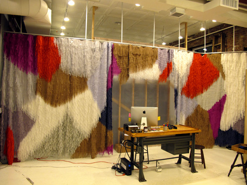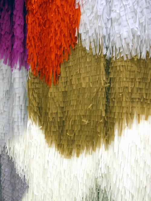 La maravillosa pared modulada con cajas de distintas proporciones perfectamente combinadas con las barras en azul me ha maravillado, pero con lo que me ha terminado de matar es con la pared hecha con simples montantes de madera cubierta con esta maravillosa instalación de The Confetti System.
