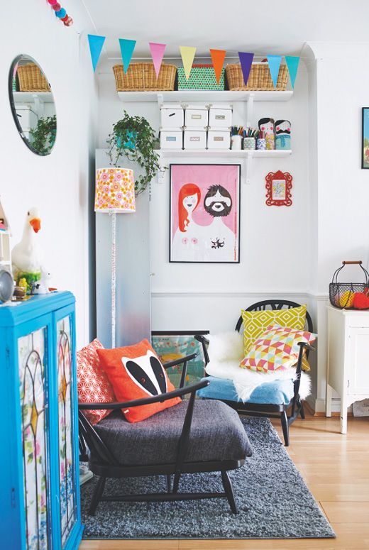 Hoy toca una casa con mucha luz, mucha luz, mucho blanco y mucho color. Quizá fuera la casa de una chica de unos 30 y pico, en el centro, y que trabaja con niños. Suele llegar pronto a casa después de trabajar, y le encanta pasar las horas dibujando y tomando el té en cualquiera de los rinconcitos de su apartamento.