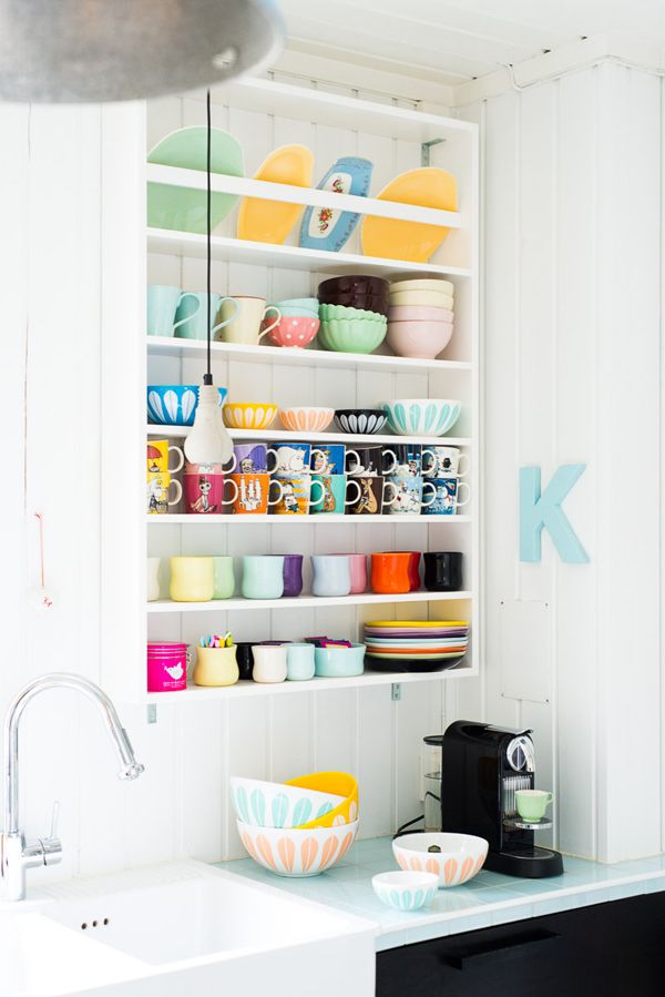 Ha utilizado pinturas de colores para darle un nuevo aire a esos muebles viejos que consiguió de casa de sus padres y algunos amigos. La cocina es un lugar muy vivido, ya que pasa allí mucho tiempo cocinando y aprovechando la mesa de la cocina y su maravillosa luz para ojear revistas, revisar la agenda o leer el correo.