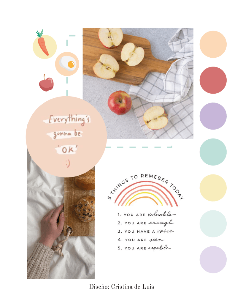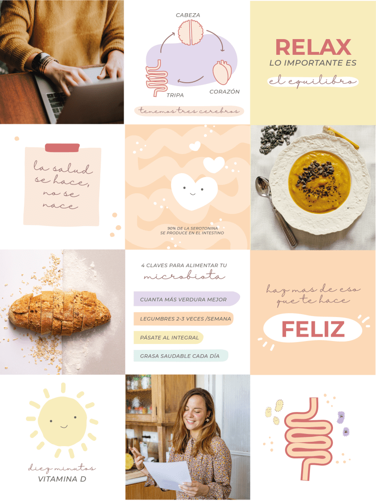 Además del pack de diseño, Marta me encargó también el pack de publicaciones para todo el mes. Con este pack preparo toda la parte gráfica para cubrir las publicaciones de un mes completo de Instagram. Normalmente lo hago con foto, pero en este caso lo que hicimos fue una mezcla de fotos de Marta y de ilustraciones y composiciones gráficas mías. Tengo que decir que he disfrutado como una enana diseñando estas publicaciones. Jamás pensé que tendría que dibujar un intestino amoroso 😀