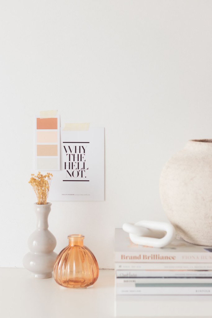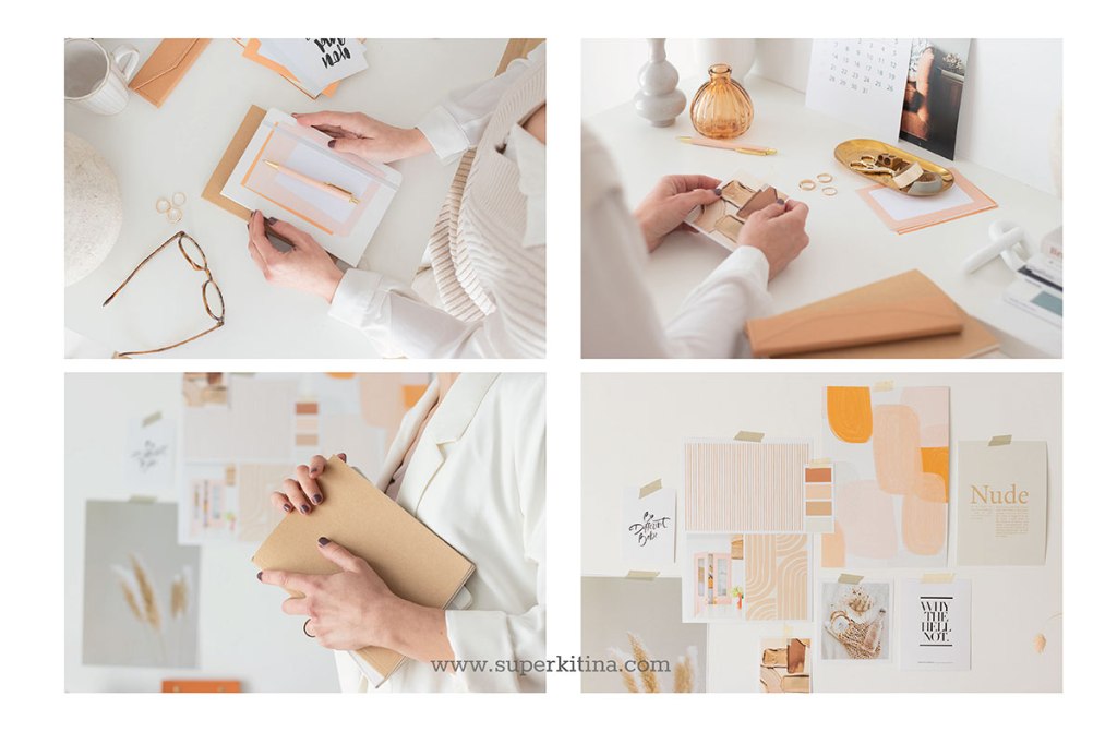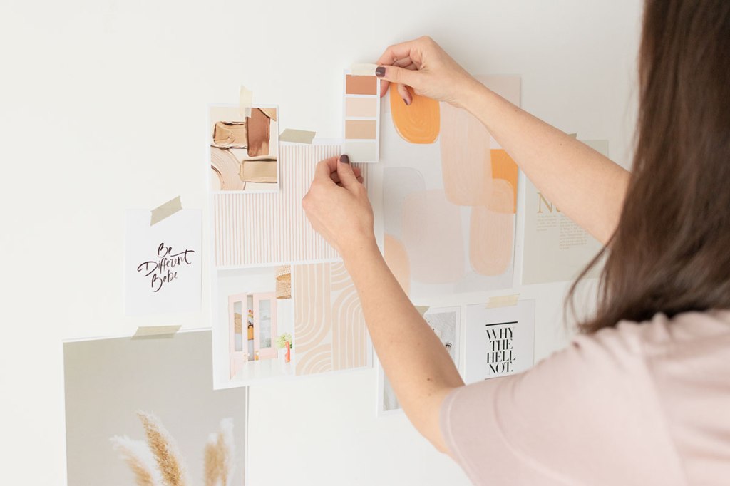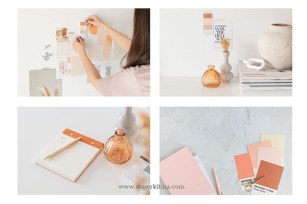 Un moodboard en la pared, un escritorio lleno de elementos decorativos bonitos, manos que anotan ideas, un café a media mañana…
